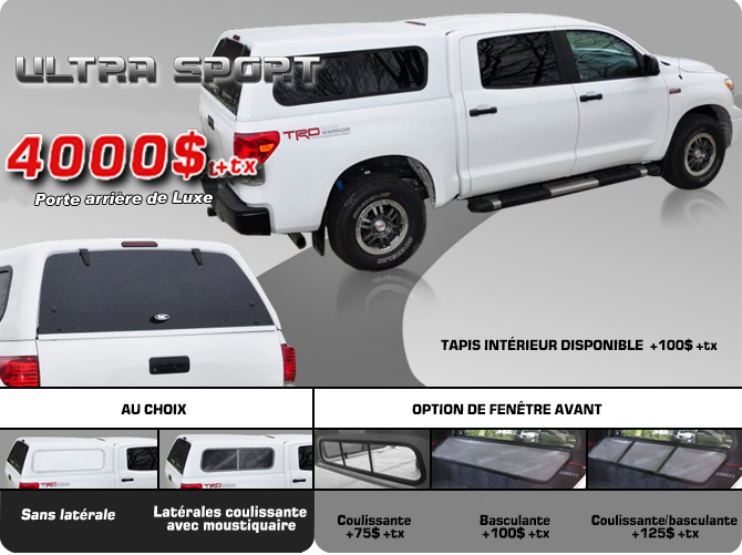 La différence se situe au niveau de la porte arrière, la Ultra sport possède la porte en verre trempé bombé sans cadrage de style ''vus''. Elle possède la poignée automatique centrale de qualité supérieur. Elle possède une jupe de fibre extérieur qui moule votre camion et une jupe intérieur permettant d'utiliser les petites serres en J au lieu des grosses serres en C (PAS DISPONIBLE CHEZ LES AUTRES FABRIQUANTS)